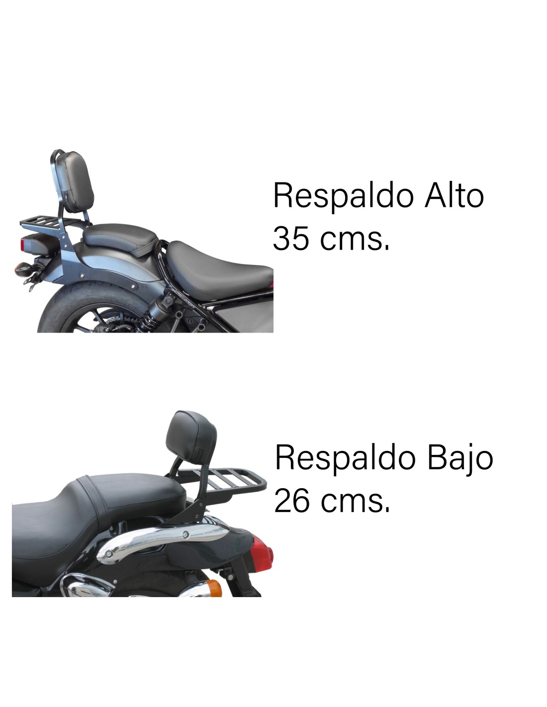 Respaldos Motos Custom Cromado o Negro Mate, con Respaldo Alto o Bajo, con parrilla portabultos, sin parrilla. Escoge entre las diferentes opciones Selecciona el modelo para tu moto.